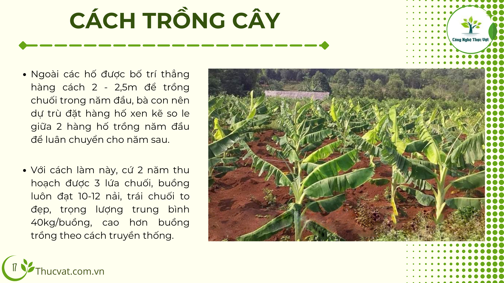 - Đất trồng: Cây Chuối thích hợp trồng ở vùng đất có tầng canh tác sâu từ 50cm trở lên, thoát nước tốt, không bị ngập úng.