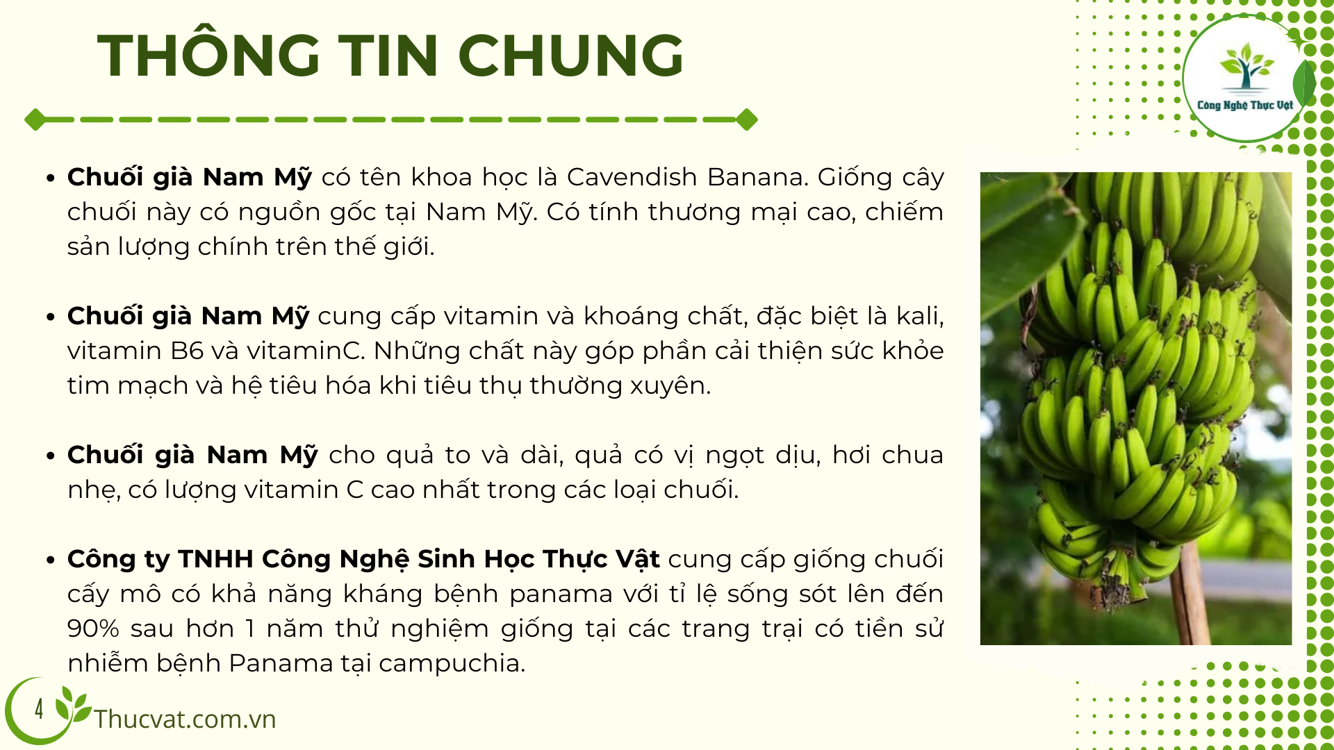 - Cây Giống Chuối Già Nam Mỹ có tên khoa học là Cavendish Banana. Giống cây chuối này có nguồn gốc tại Nam Mỹ. Cây đạt chuẩn từ 4-6 lá, năng suất đạt từ 30-40kg/cây và có thể lên đến 50kg khi thu hoạch.