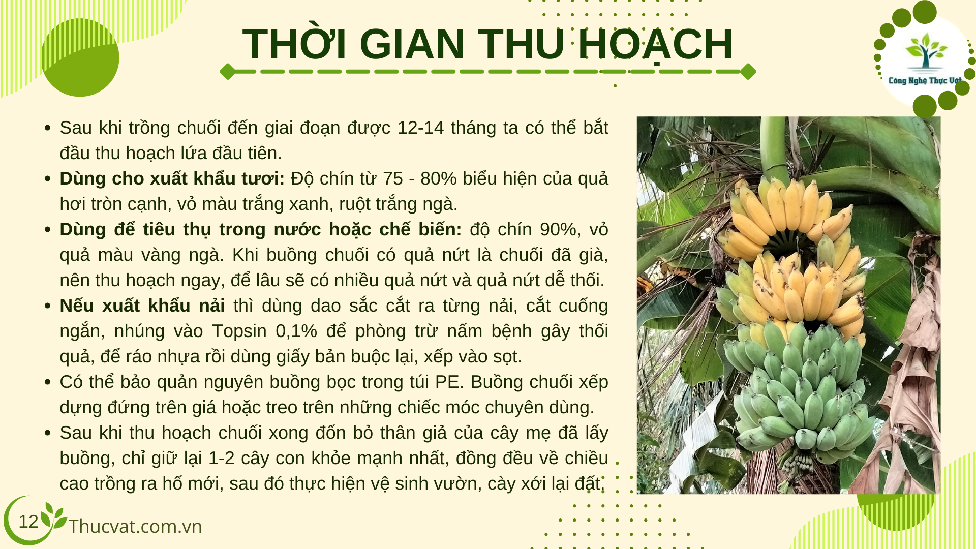 - Sau khoảng 14 tháng trồng bạn đã có thể thu hoạch được những buồng chuối tây đầu tiên. Độ chín của cây thường được xác định qua màu sắc lớp vỏ. Một buồng trung bình sẽ cho từ 10-12 nải. Mỗi buồng nặng từ 30-35kg.