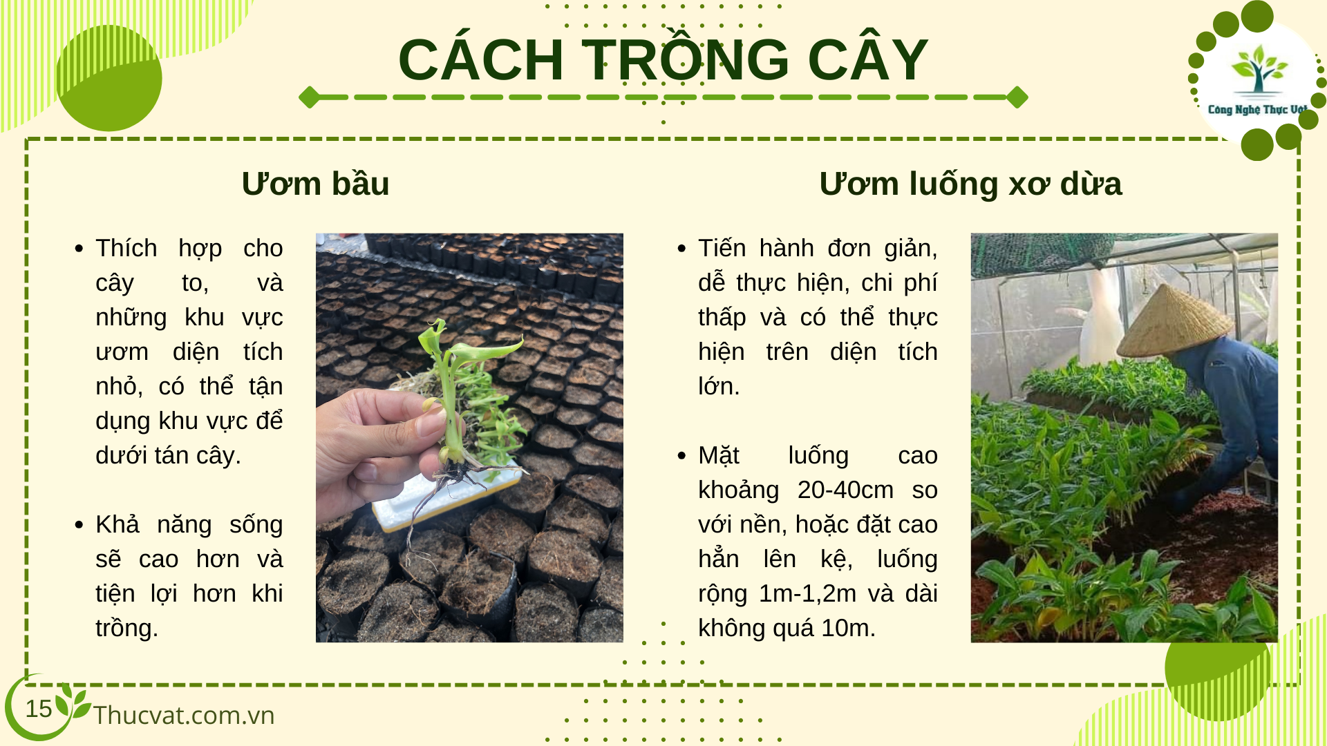 - Chọn thời điểm râm mát hoặc sáng sớm để trồng là thích hợp nhất. Dùng xẻng đào hố nhỏ ở giữa hố đào trước đây để vừa bầu cây con. Đặt cây con vào và lấp đất nhỏ lên kín quanh gốc. Sau đó dùng rơm rạ ủ quanh phần gốc rồi tưới nước ngay để cây mau thích nghi với đất mới.