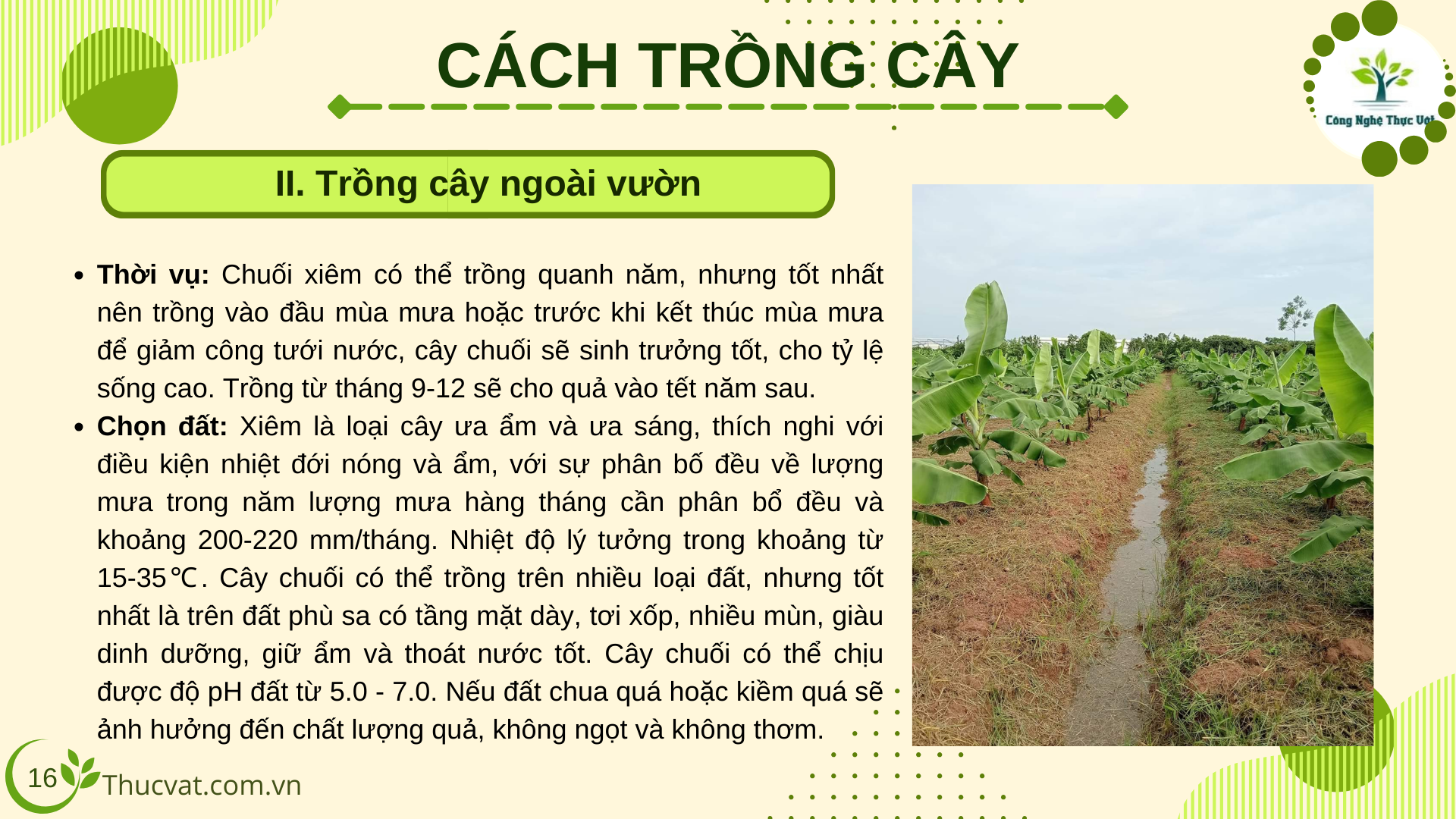 - Để cây cho năng suất cao thì cần chọn loại đất trồng phù hợp. Đất cần loại đất tơi xốp nhiều mụn và thoát nước tốt và có độ pH khoảng 6. Vị trí trồng chuối xiêm cũng cần quang đãng và đủ ánh sáng.