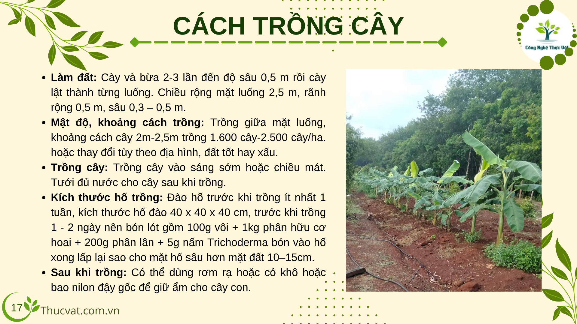 - Bạn có thể lên luống để trồng chuối xiêm. Chiều cao luống khoảng 50cm trở lên hàng cách hàng 2m. Cần làm sạch cỏ dại và phát quang trước khi trồng. Đào hố rộng khoảng 50x50x50cm rồi bón lót phân chuồng hoai mục với vôi bột để khử trùng đất 1 tháng trước khi đem cây giống trồng.
