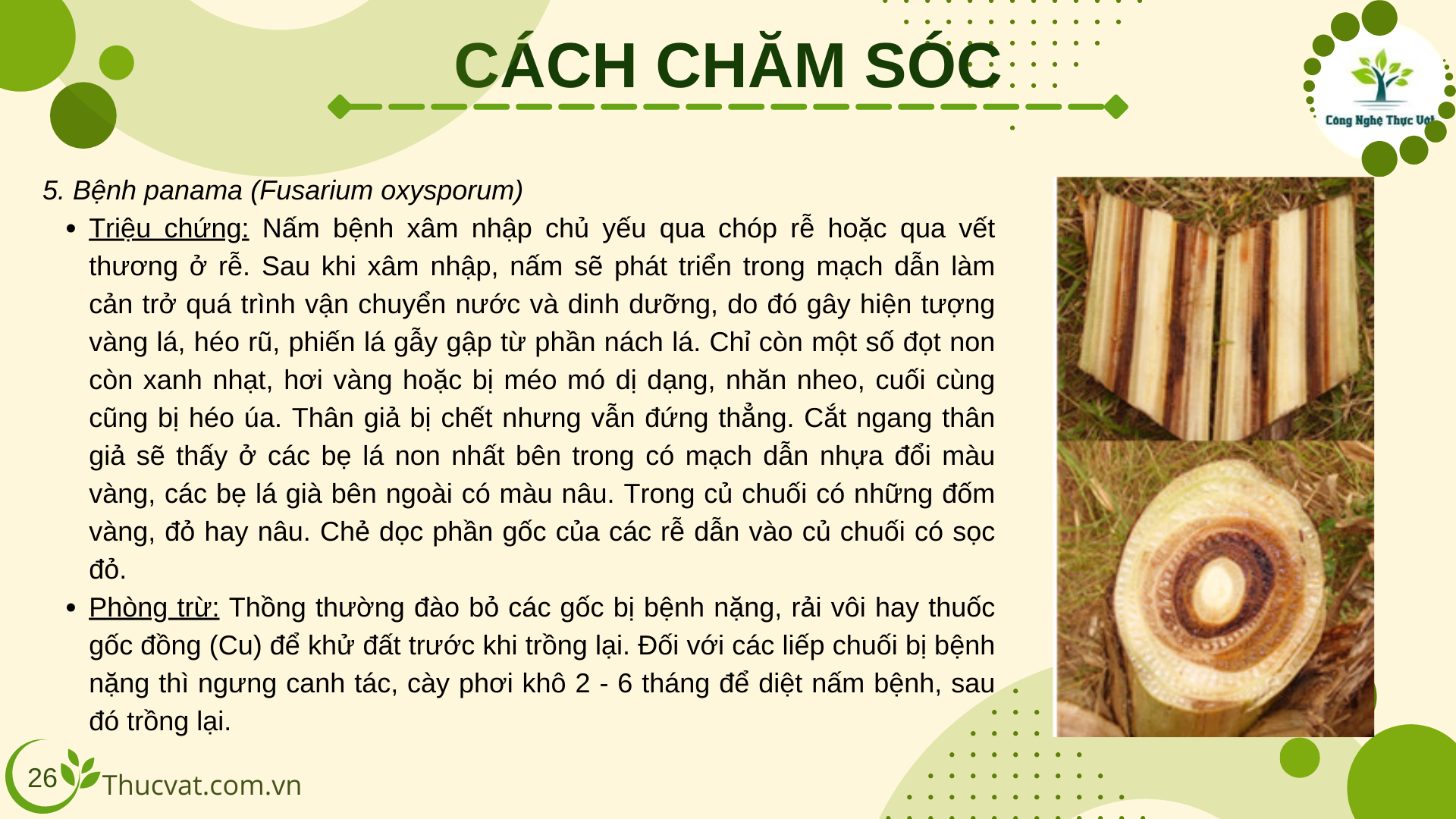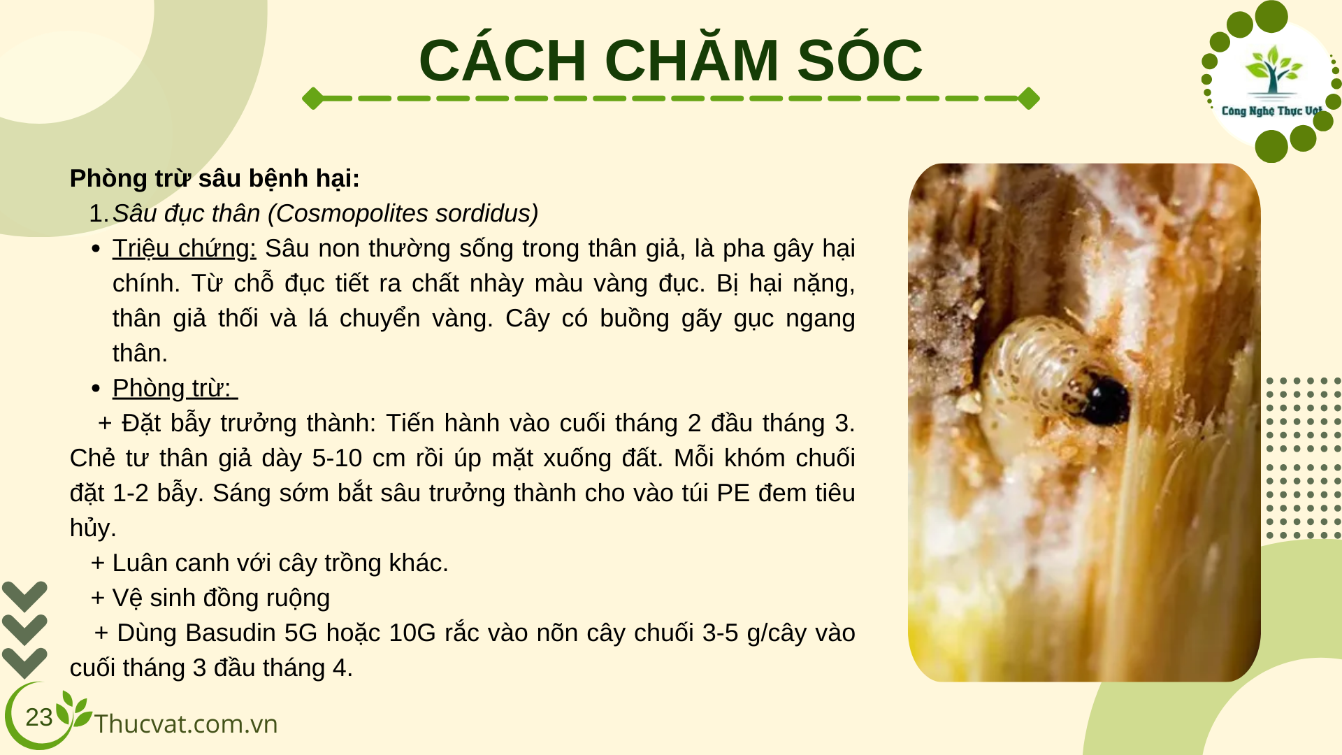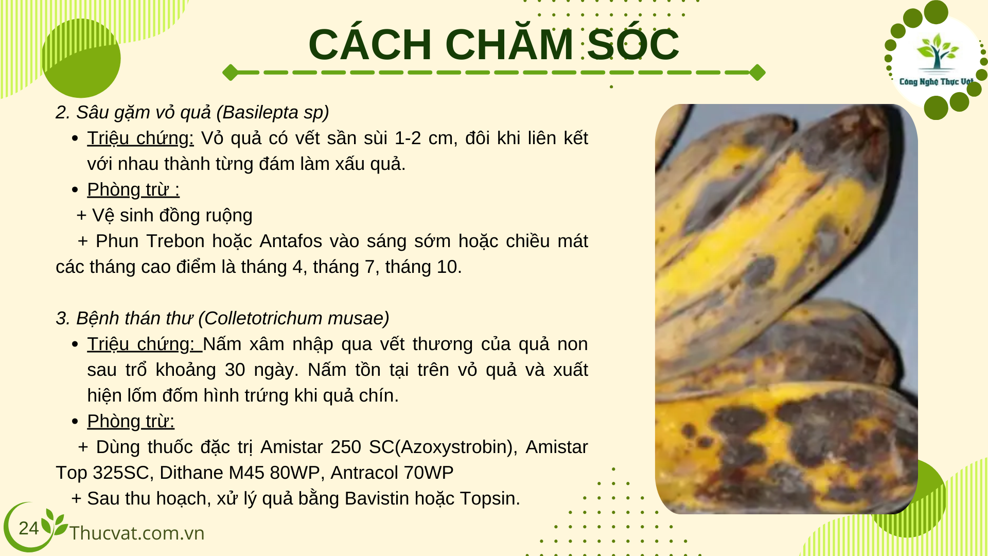 - Phòng trừ sâu, bệnh hại : Một số loại bệnh điển hình thường gặp ở cây chuối xiêm có thể kể đến như sâu đục thân, sâu ăn quả. vv