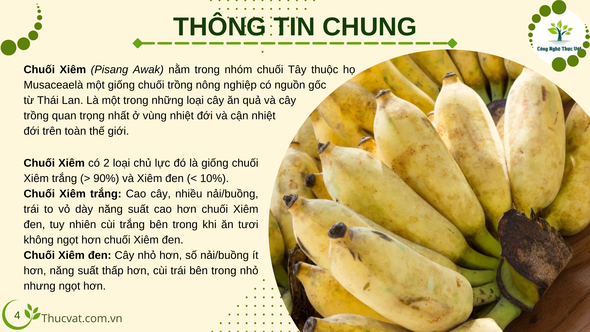 - Giống chuối xiêm có nguồn gốc xuất xứ từ Thái Lan được du nhập vào nước ta khoảng hơn 10 năm. Khác với giống chuối bản địa, Giống cây chuối xiêm cho ưu điểm nổi bật hơn là thời gian cho thu hoạch dài trên 10 năm và cây không bị sâu bệnh hay thối gốc.