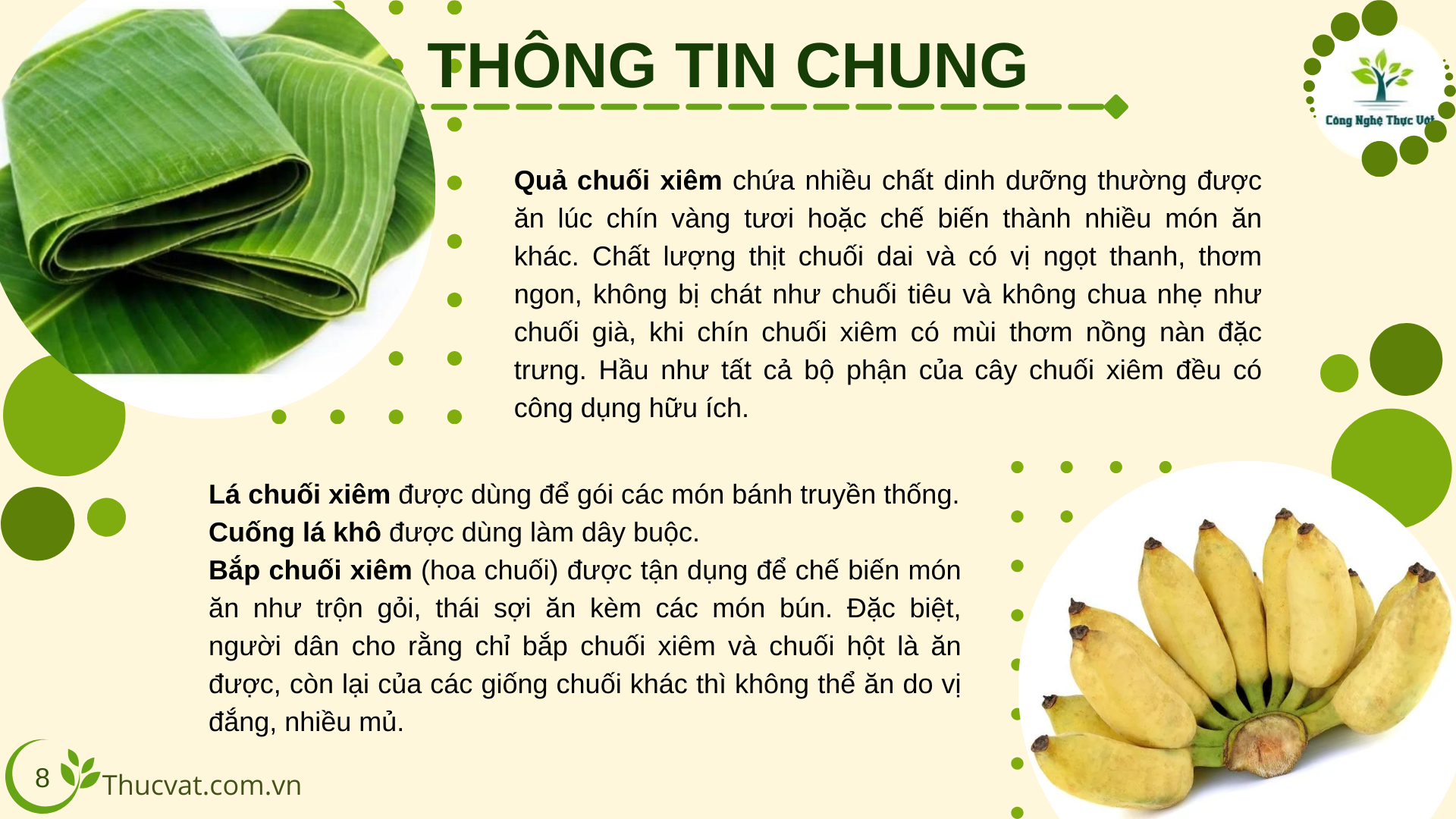 - Chuối xiêm là giống thân giả có chiều cao trung bình khoảng 3,5m. Cây có lá bản to màu xanh sáng hơn màu lá chuối tiêu. Qủa chuối xiêm không dài cong mà ngắn hai đầu thon nhỏ, phần giữa to và phần vỏ có ba gờ nhô lên. Quả Chuối xiêm khi chín có màu vàng tươi không có những đốm đen nhỏ như chuối tiêu. Khi ăn bạn sẽ cảm nhận được vị ngọt ngậy nhưng không nhão như chuối tiêu. Điểm đặc biệt là giống cây chuối xiêm cho quả to hơn nên chỉ cần ăn một quả chuối đã cho cảm giác ngang ngang bụng.