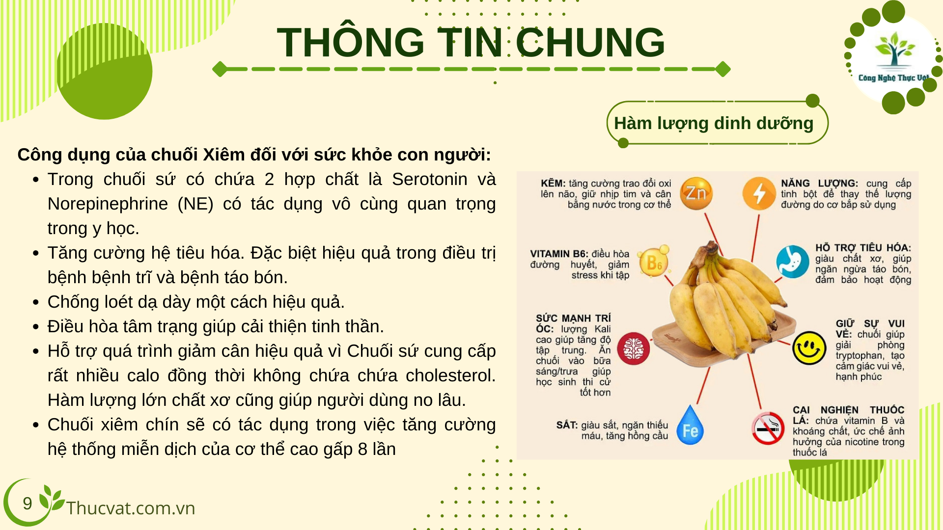 - Chuối xiêm chứa nhiều acid amin tryptophan - một thành phần cần thiết để sản xuất ra serotonin. Loại chất này có tác dụng giúp tâm lý thoải mái, cải thiện tinh thần, chống lại bệnh trầm cảm.