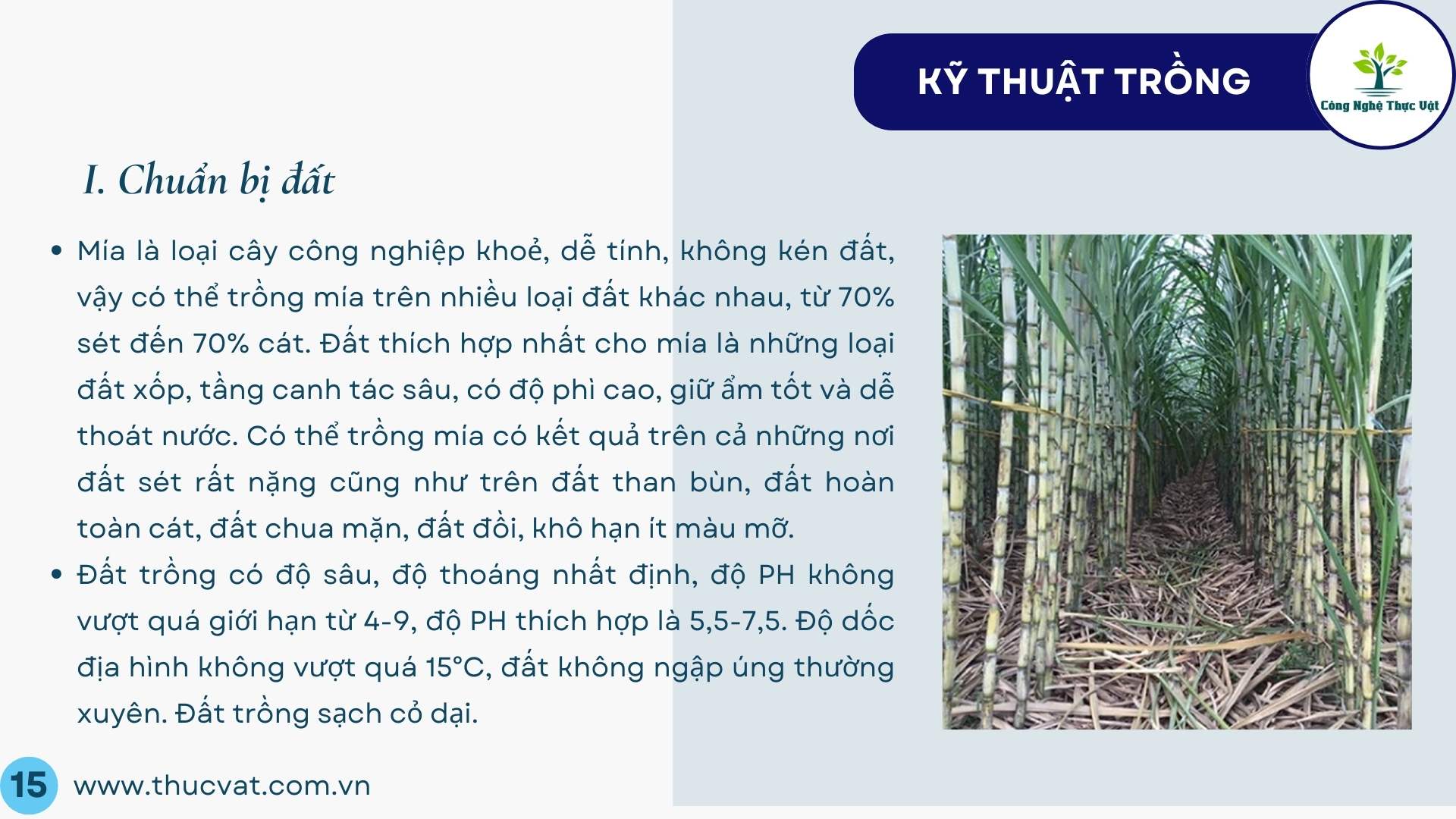 - Mía là loại cây công nghiệp khoẻ, dễ tính, không kén đất, vậy có thể trồng mía trên nhiều loại đất khác nhau, từ 70% sét đến 70% cát. Đất thích hợp nhất cho mía là những loại đất xốp, tầng canh tác sâu, có độ phì cao, giữ ẩm tốt và dễ thoát nước. Nhưng cây mía thích hợp nhất trên đất phù sa cát có độ pH = 4 – 8.
