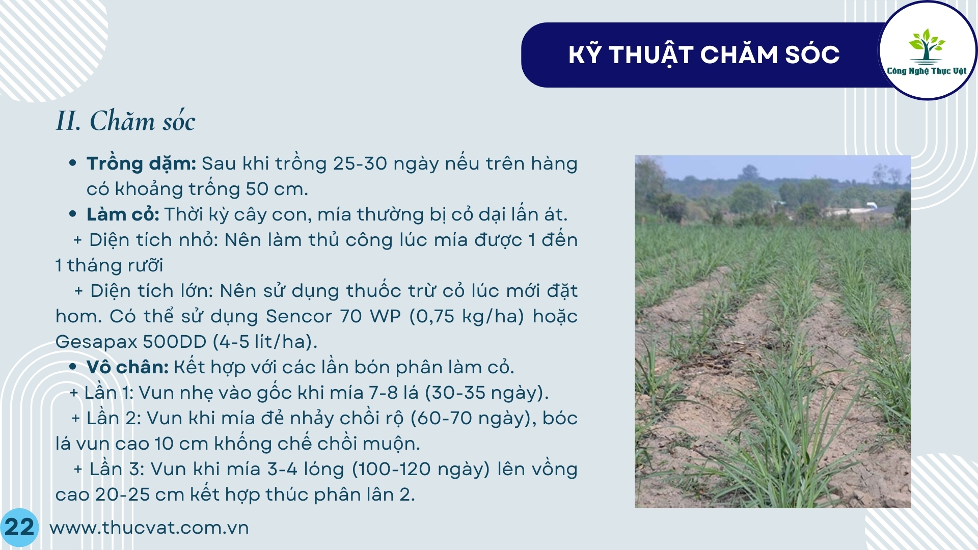 - Sau trồng 30-40 ngày cần làm cỏ, xới và vun gốc cùng với 2 lần bón phân thúc kết hợp với xới xa gốc khi bón lần 1. Xới sâu, xới gần gốc khi bón thúc lần 2. Khi mía trên 12 lá xới xa gốc, dọn sạch cỏ dưới vồng. Nếu có điều kiện kết hợp tưới đủ ẩm cho mía để đạt năng suất cao.
