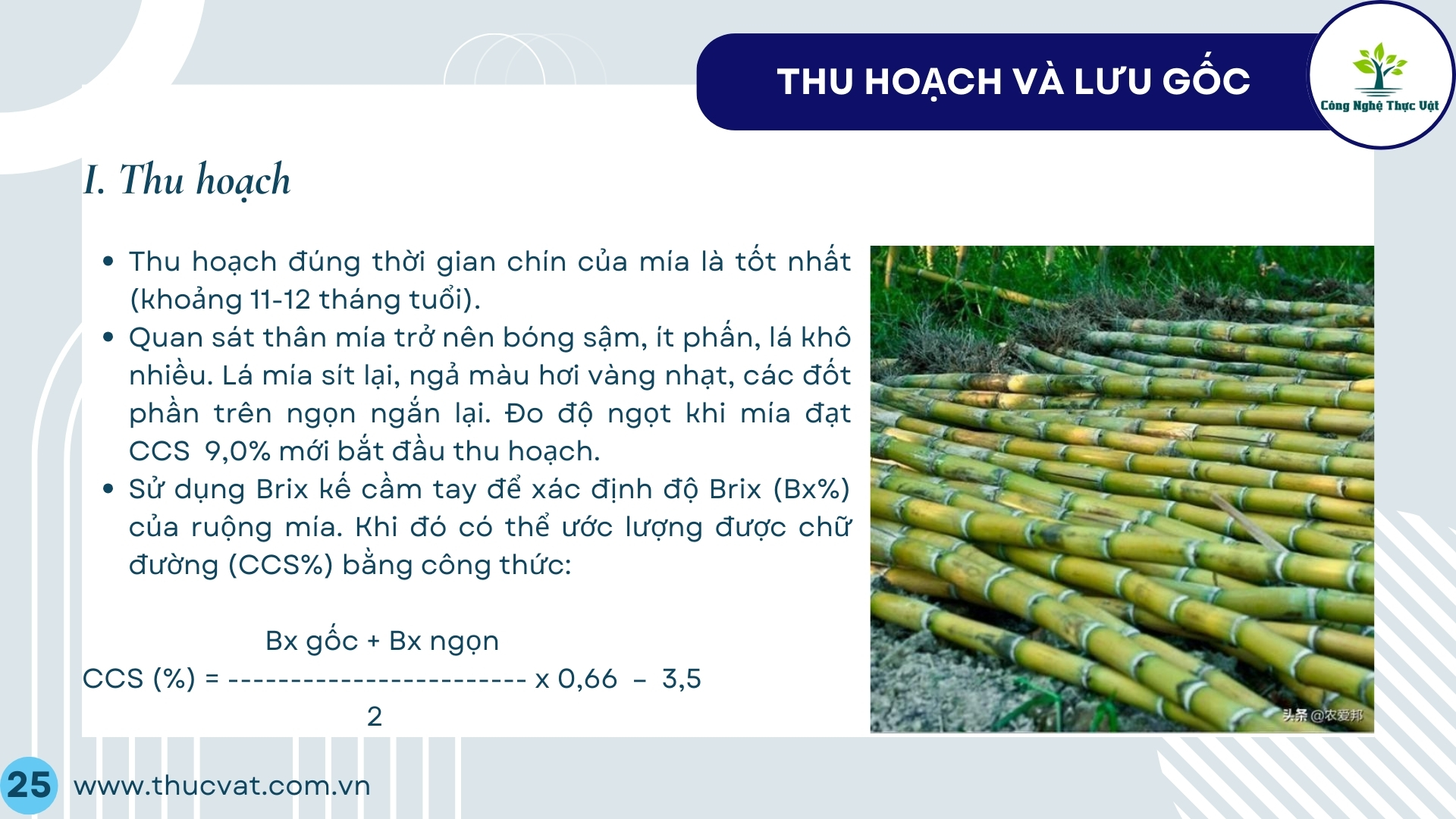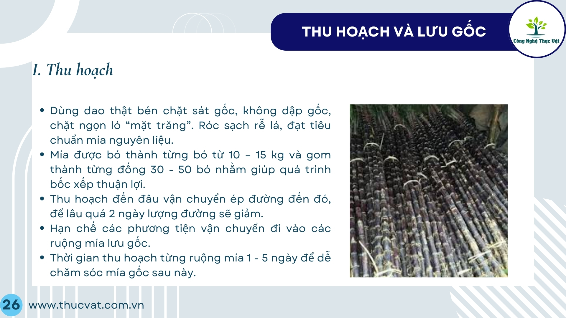 - Nếu thu hoach để chế biến: thu hoạch mía đủ độ chín (chữ đường > 10 CCS). Thu hoạch xong vận chuyển và đưa vào chế biến trong vòng 24 giờ để đảm bảo hàm lượng đường trong mía không bị hao hụt.