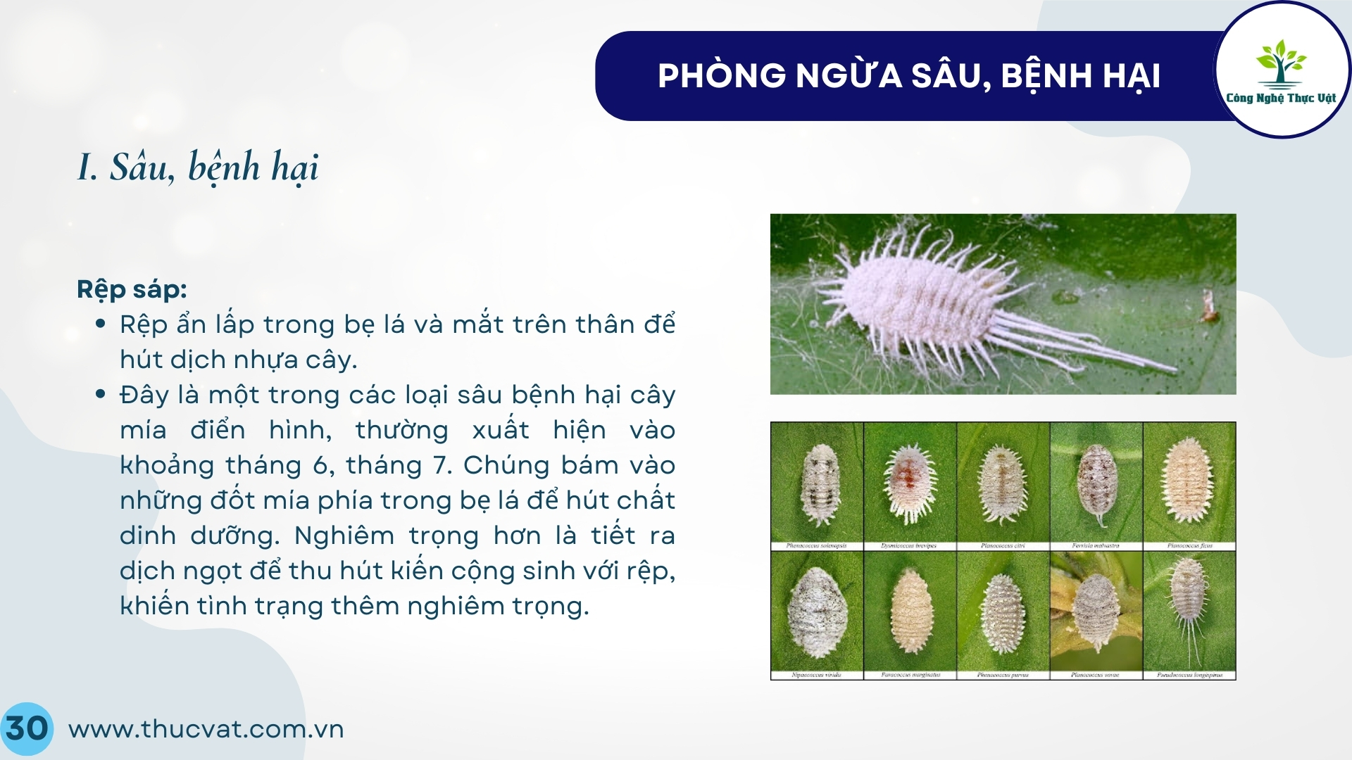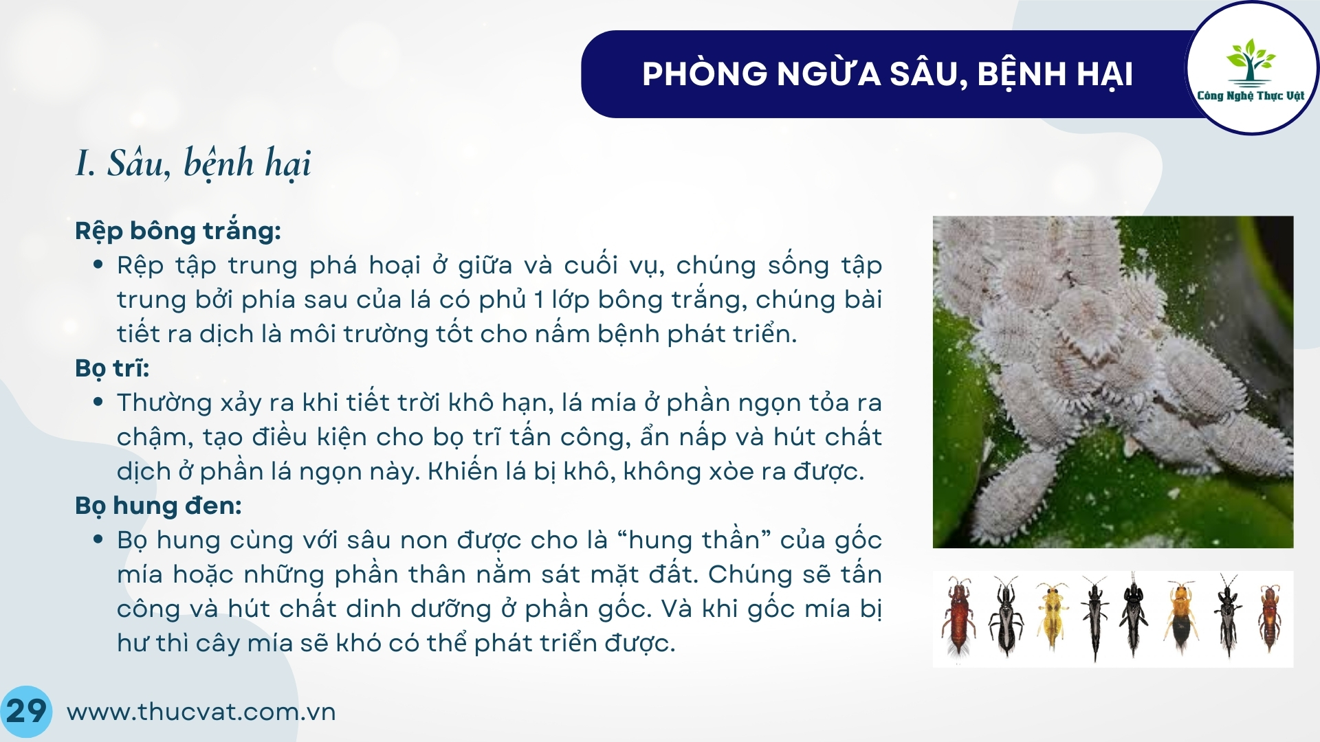 Các đối tượng dịch hại chủ yếu là: Rệp bông trắng, bọ hung đục gốc, sâu đục thân, bệnh than đen, bệnh trắng lá.