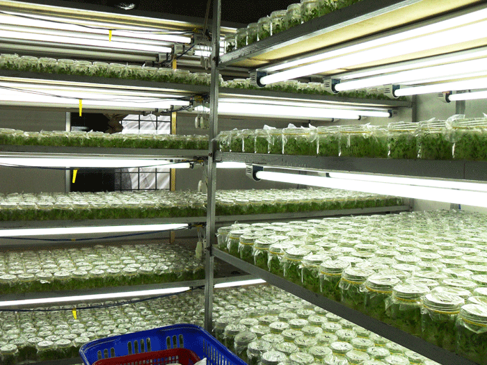 - Thời gian chiếu sáng thích hợp là từ 12-18h/ngày. Cường độ ánh sáng thích hợp cho mô nuôi cấy là 1500-2500 lux.