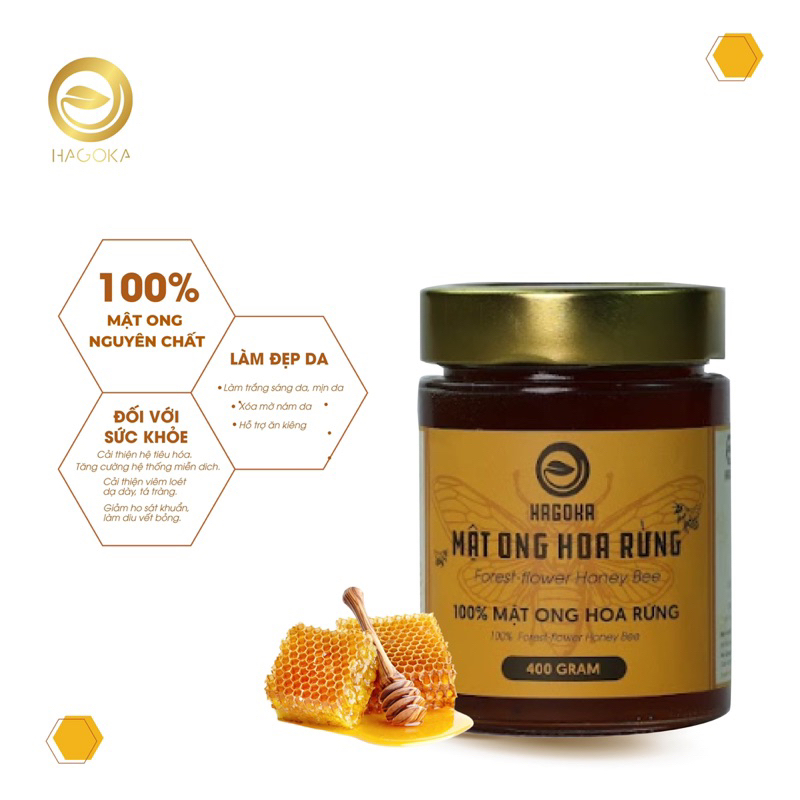 - Mật ong rừng nguyên chất Hagoka do ong mật đi lấy phấn hoa về tổ tạo thành. Thành phần của mật ong nguyên chất gồm các loại đường tự nhiên, nước và rất nhiều vitamin và dưỡng chất.